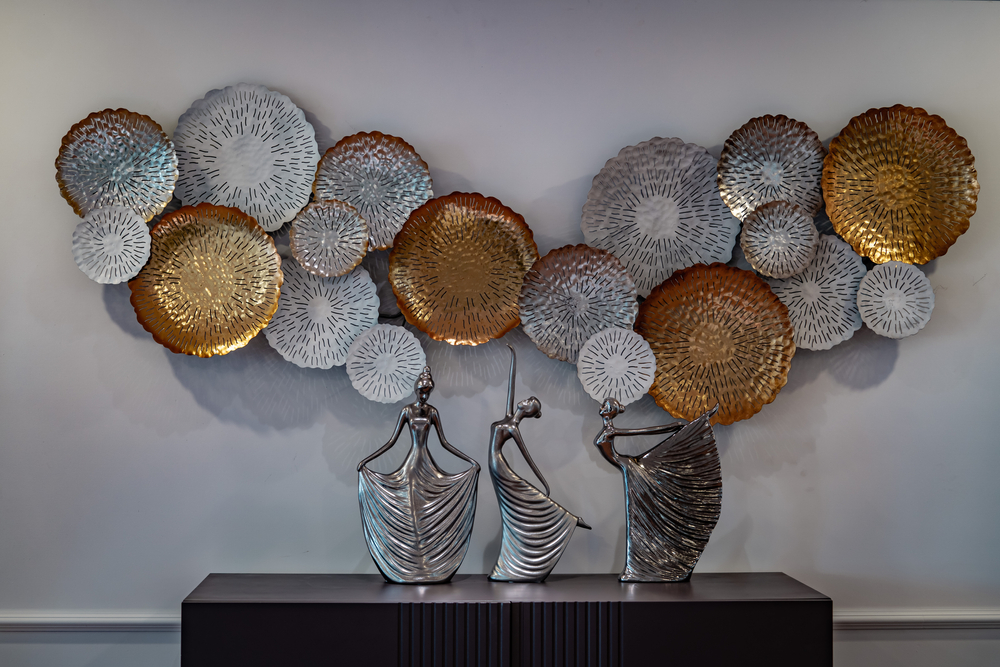 Odaberite nekoliko ključnih komada od metala: svjetiljke, okvire za slike ili male dekorativne predmete poput posuda i vaza. Birajte materijale poput mjedi, mesinga ili brušenog čelika koji unose toplinu i reflektiraju svjetlo. Kombinirajte ih s komadima stakla, stolovi, ukrasne boce ili vaze stvaraju prozračnost i osjećaj prostranosti.